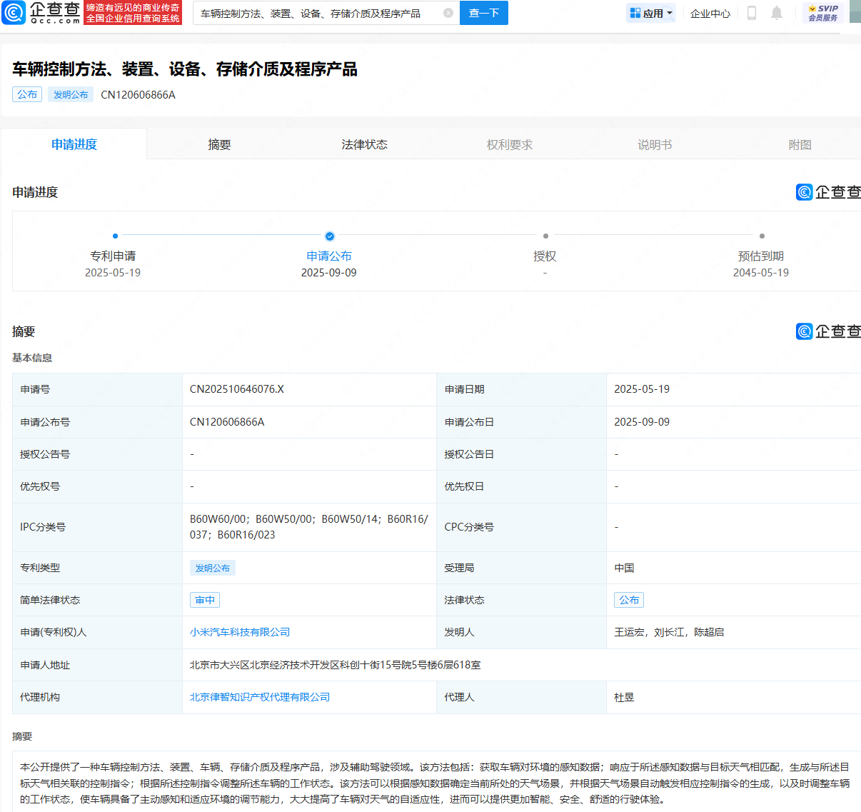 9月9日,小米汽车科技有限公司申请的“车辆控制方法、装置、设备、存储介质及程序产品”专利公布。专利摘要显示,本公开提供了一种车辆控制方法、装置、车辆、存储介质及程序产品,涉及辅助驾驶领域。该方法包括:获取车辆对环境的感知数据;响应于所述感知数据与目标天气相匹配,生成与所述目标天气相关联的控制指令;根据所述控制指令调整所述车辆的工作状态。该方法可以根据感知数据确定当前所处的天气场景,并根据天气场景自动触发相应控制指令的生成,以及时调整车辆的工作状态,使车辆具备了主动感知和适应环境的调节能力,大大提高了车辆对天气的自适应性,进而可以提供更加智能、安全、舒适的行驶体验。